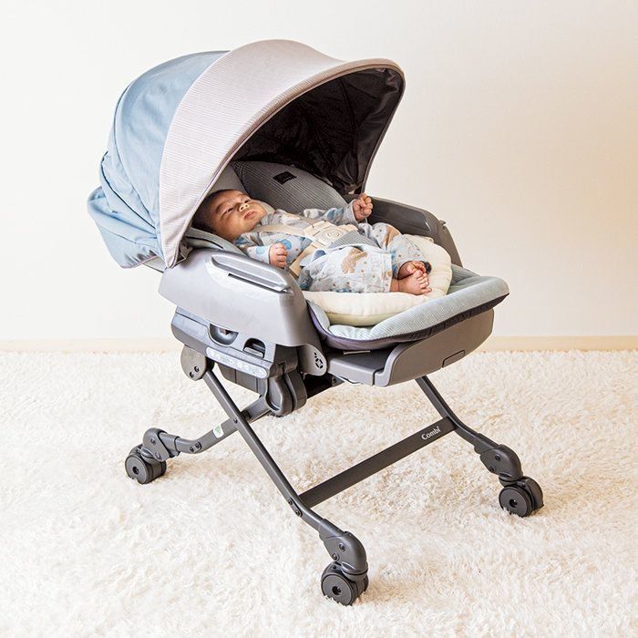 ママの心拍に近い周期の揺れで赤ちゃんも安心。また、全身を覆うホロが適度な暗さをつくり「ぐずっていてもすぐに落ち着く」「ホロで覆うと、ほどなくウトウト」というママたちの声も。手動と電動から選べます。
