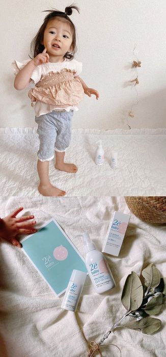 「『ドゥーエ ベビー UVプロテクトミルク』の白くならない、のびがいいところがお気に入り♪」とたまひよ公式インスタグラマーの南里真以さん。また、「ドゥーエ ベビー ミルキーローション」について、「毎日おふろ上がりに使用。ポンプ式で片手で出せるからとってもラク★ 寝返りとずりばいで動き回るからサッと塗れるのが助かります」とのコメントも。[南里真以さん&お子さん(8カ月)]
