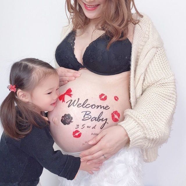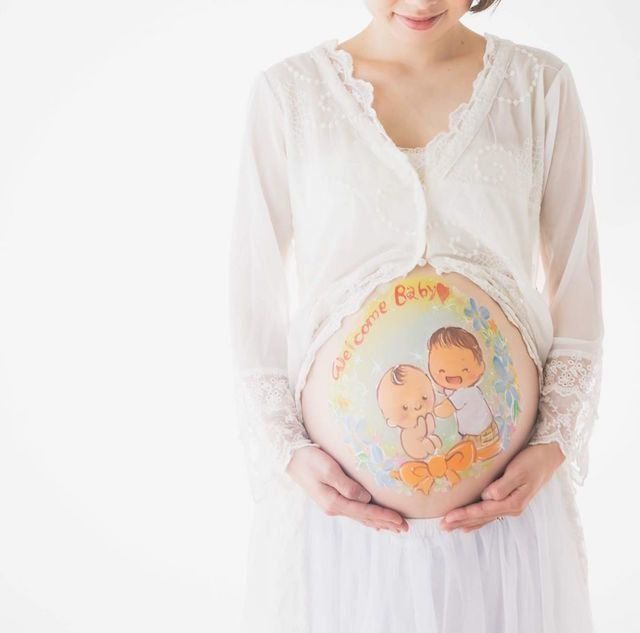 たまひよ grammerのいっくんママさん(@tsuki393939)は、フォトスタジオでお兄ちゃんと生まれてくる赤ちゃんをおなか全体に描いて撮影。