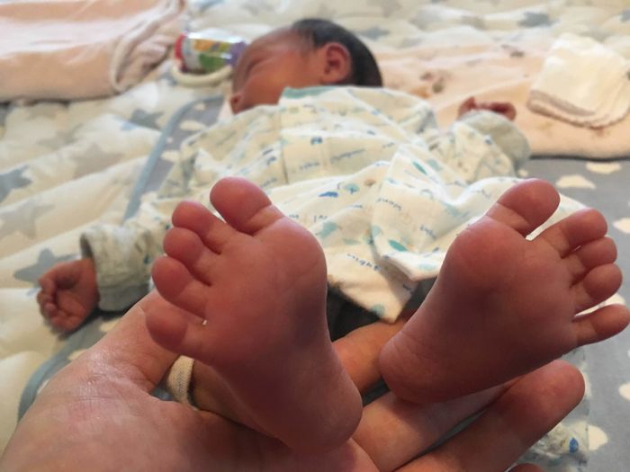 出産前日、午後8時ごろから陣痛が始まり病院へ。陣痛に耐えつつ、何度もトイレに行きながら子宮口が開くのを待ちました。結局、朝になっても子宮口は開かず、先生が意図的に破水を誘発して、ようやくいきむ段階になりました。
