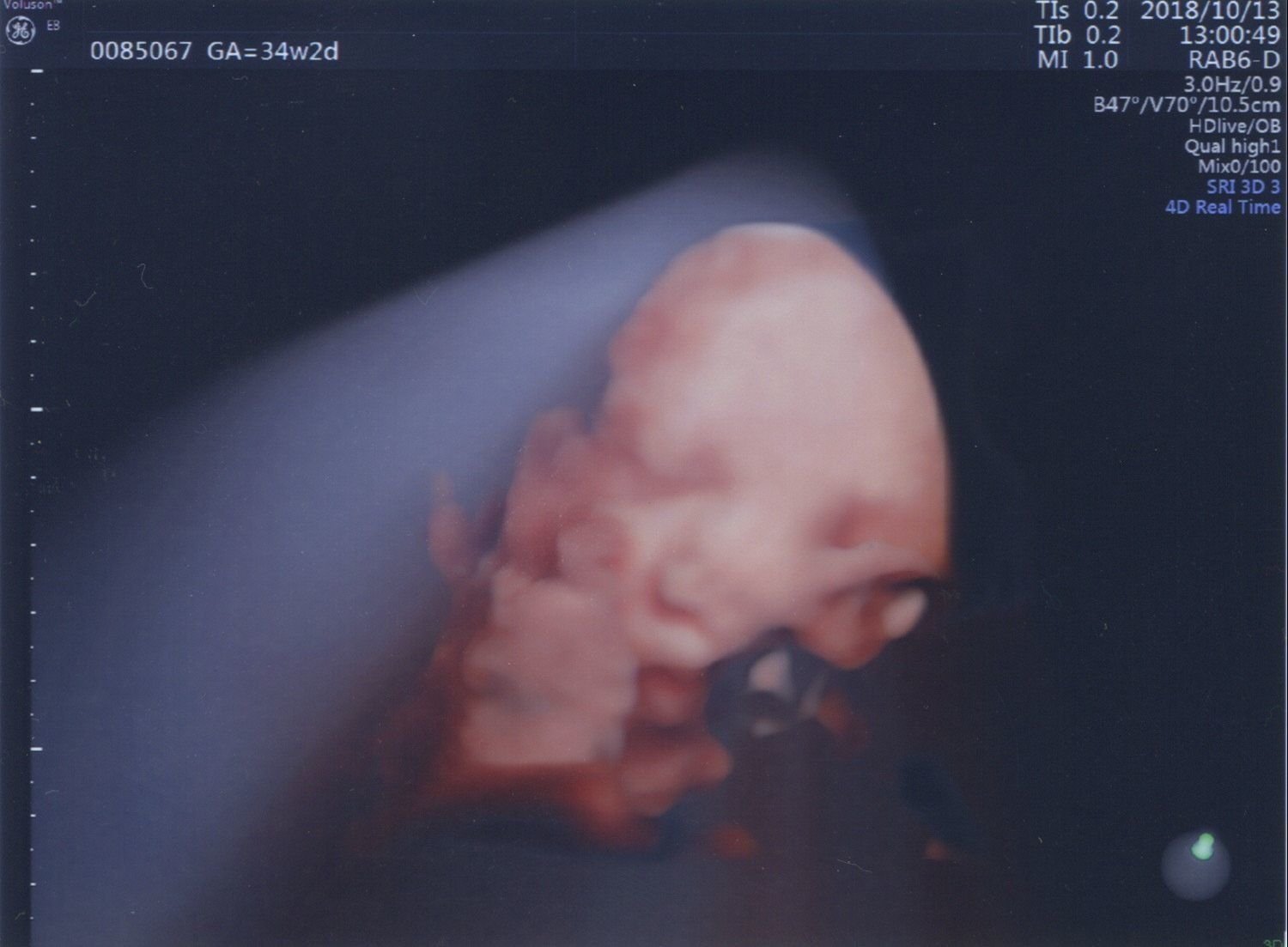 妊娠34週目。この頃はいろいろな表情や動きを見せてくれるようになり、エコーを見るのが楽しみでした。よく手を頬や口元に当てているのは、生まれた今も変わりません。