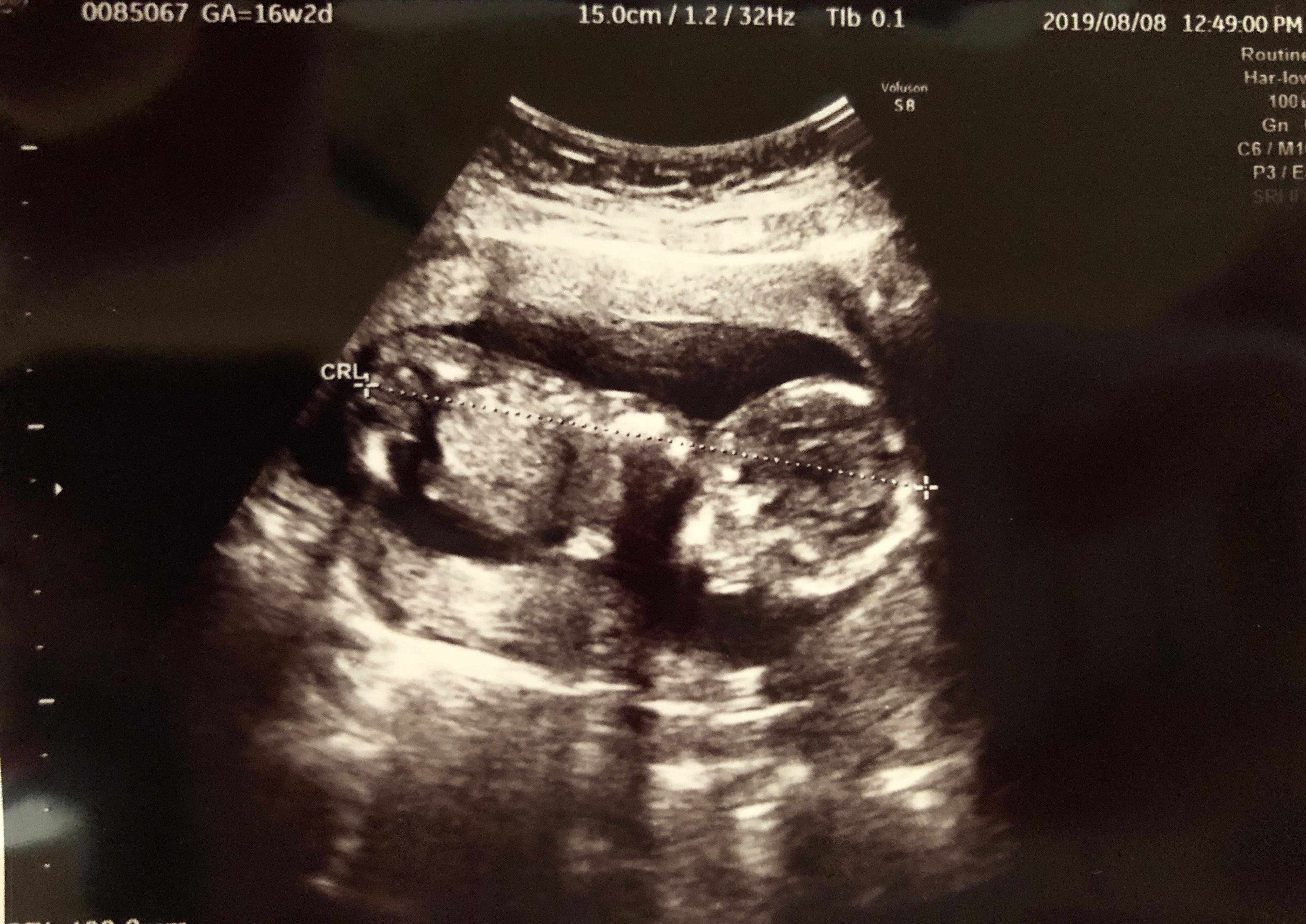 妊娠16週のエコー写真で、安定期に入ったところです。次の健診までが長く感じていた長男のときとは違い、長男のお世話に追われて毎日が過ぎるので、私は「もう安定期!?」という感覚でした。