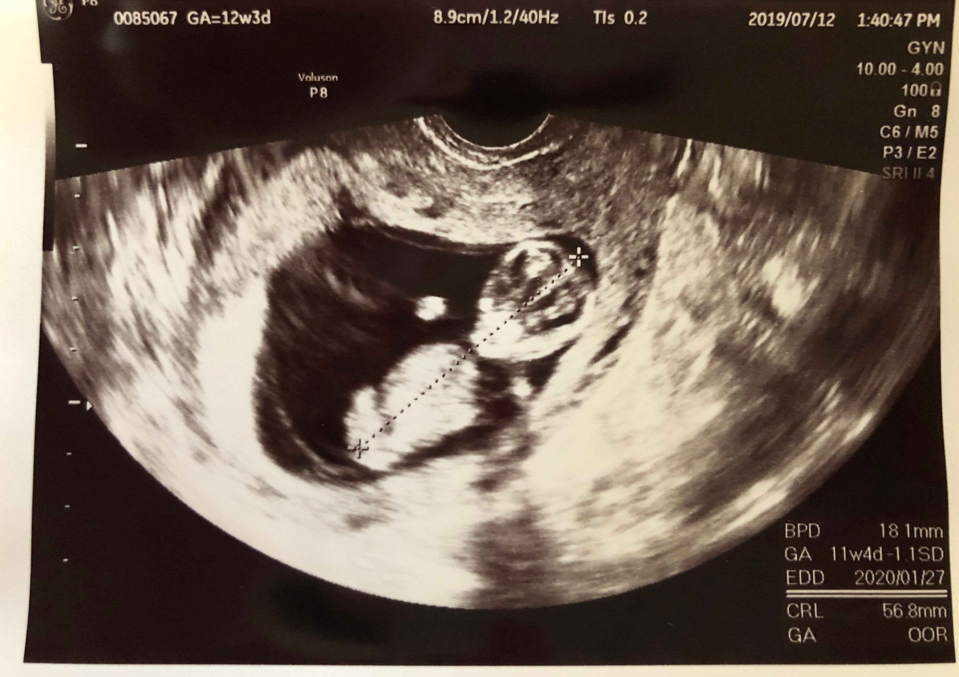 妊娠12週での健診。赤ちゃんは両手を挙げて、バンザイポーズを見せてくれました。つわりでだるさと眠気がひどく、長男のお世話で精一杯の毎日。自分のことは後回しになり、体重が6kgも減少してしまいました。健診ではケトン体も出てしまい、先生から注意を受けました。