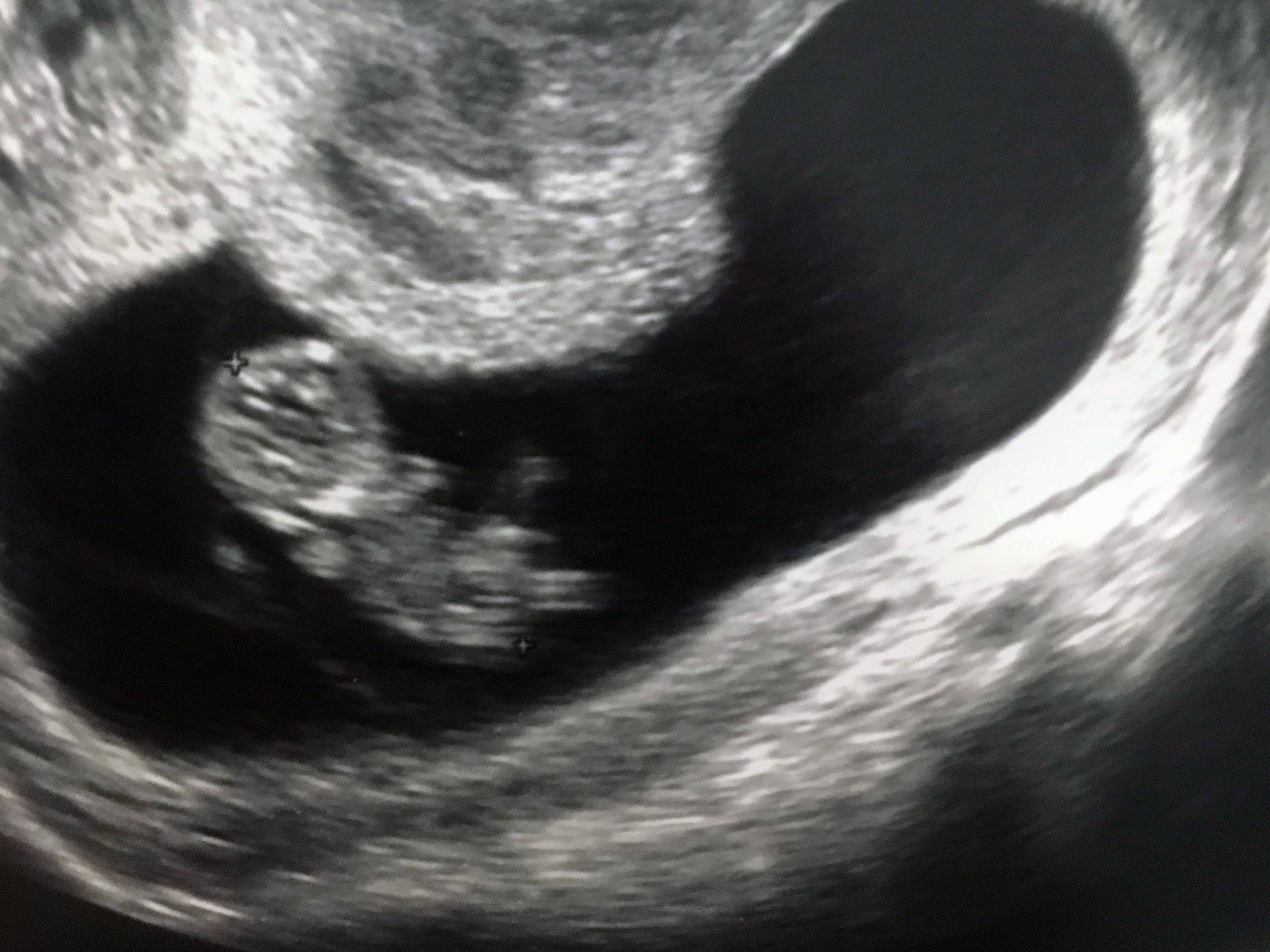 妊娠3ヶ月に入ったばかりの健診で撮影したエコー写真です。中央左側に見えるのが赤ちゃん。頭と体がはっきりしてきて、急に人間っぽい形に成長していてびっくり!
