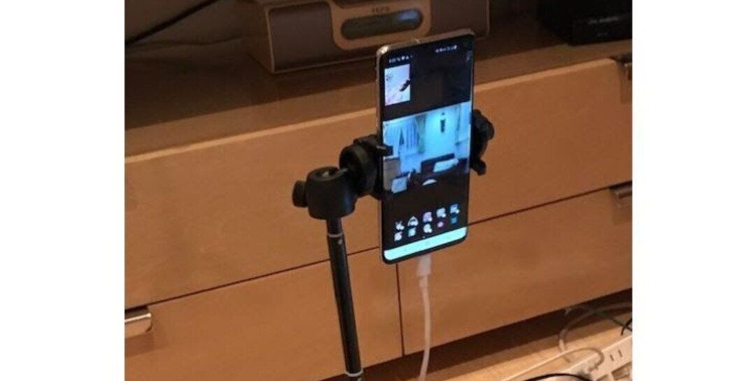 まず分娩を行う部屋に三脚を立て、妊婦の頭側に設置します。そして出産前にLINEのビデオ通話画面を開き、家族のスマホとつないでデモンストレーションを行います。