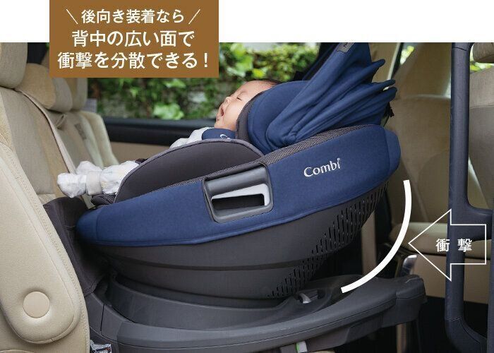 もしもの事故は、前方からの衝突が約8割(※2)。そこで、コンビの「THE S」は安全性が高い後向き装着にこだわりました。背中の広い面で前方からの衝撃を受けとめて分散し、産まれたての赤ちゃんを守ります。もちろん、超・衝撃吸収素材エッグショックも搭載されています。