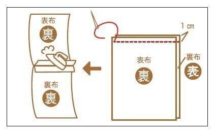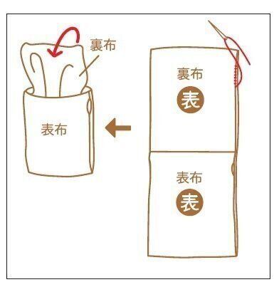 返し口から外表に返し、アイロンで形を整えます。返し口をはしご縫いで縫いとじましょう。次に、図のように裏布を表布に入れ込み、形を整えます。