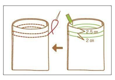 図のように、リボンを通す部分にチャコペンで縫い線を書きます。次に、縫い線どおりにこまかくなみ縫いしましょう。