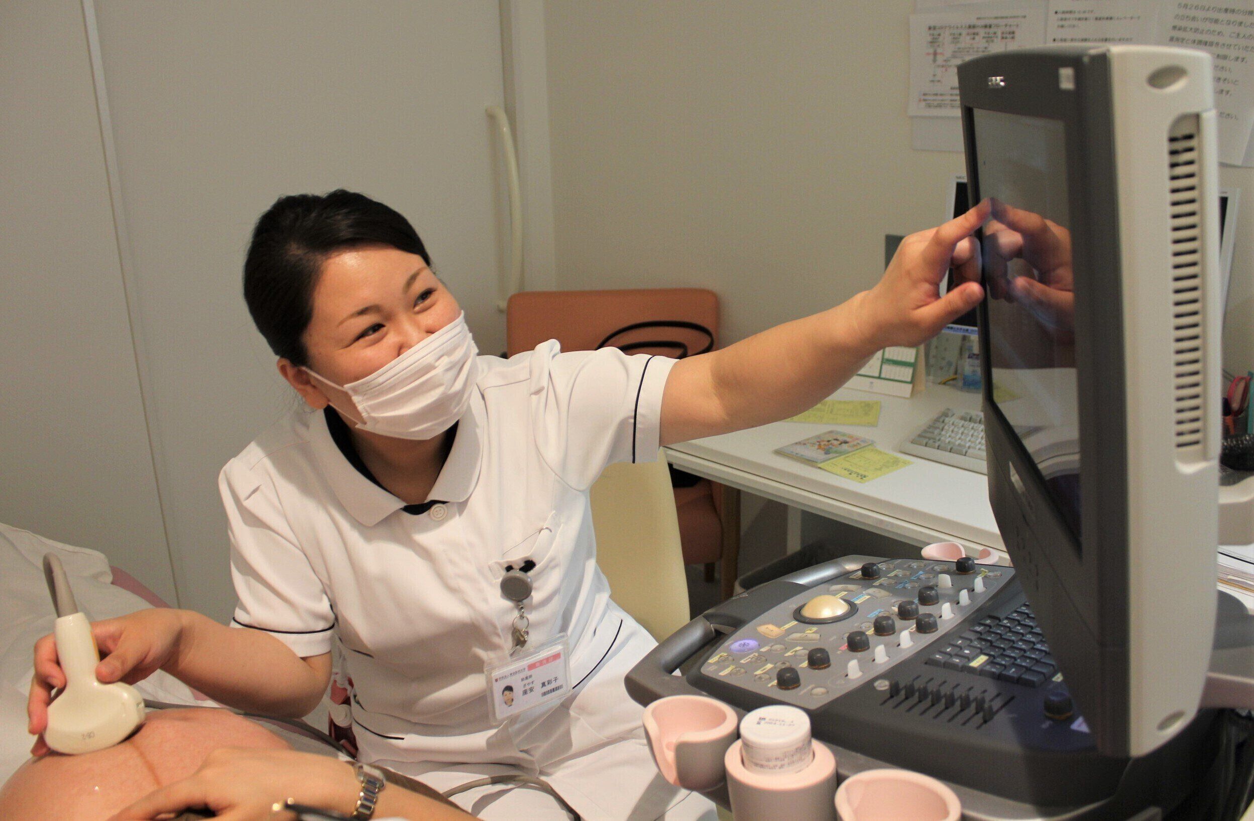 おなかの中の様子をモニターでチェック。エコー検査は、赤ちゃんと妊婦さんのコミュニケーションツール。お母さんとの対面が待ち遠しい!