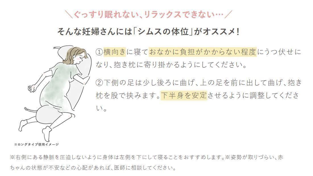 「シムスの体位」は妊娠前ではなかなかとらない姿勢なので、どうやってとるのか難しいとの声も。そこで、この姿勢がグッととりやすくなり、よりリラックスができると、多くの妊婦さんに選ばれているのが「抱き枕」です。