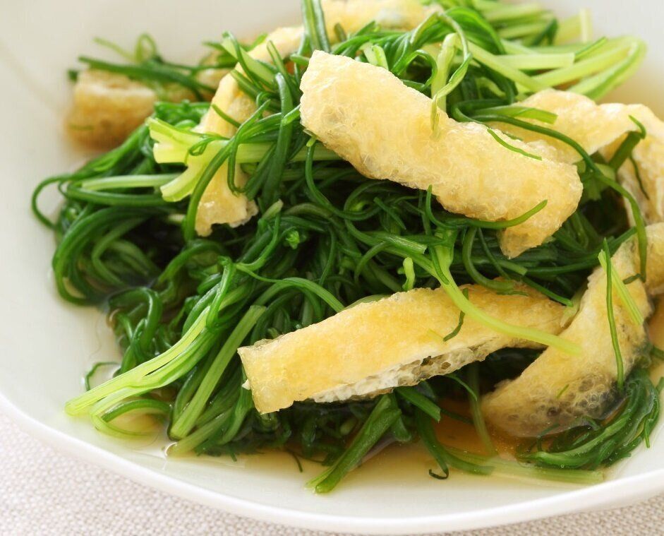 このレシピは、葉酸が豊富な豆苗、ほうれん草、小松菜、かぶなどで作ってもOKです。パパっとできるので、いつもの献立に1品たしてみて。