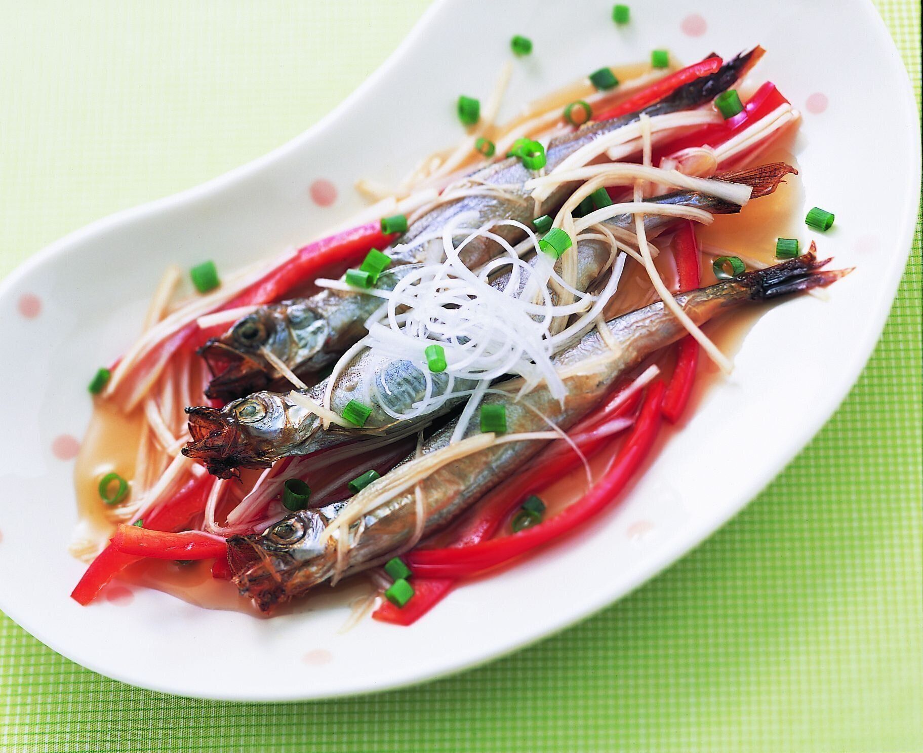 (3)干ものは焼いて、熱いうちに(1)のたれに(2)と一緒に漬け込む。器に盛り、小ねぎの小口切りを散らす。