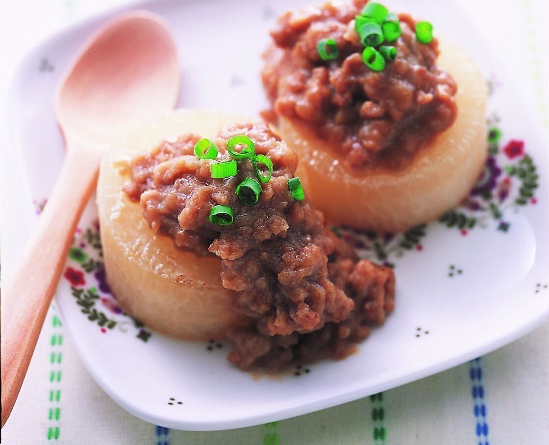 (3)(1)の大根を器に盛り、(2)の肉みそをかけ、小ねぎの小口切りを散らす。