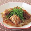 (4)フライパンにごま油を入れて強火で熱し、(1)を炒める。肉の色が変わったら(2)を加えて炒め、色が鮮やかになったら(3)を加えて混ぜる。Aを順番に加え、炒め合わる。