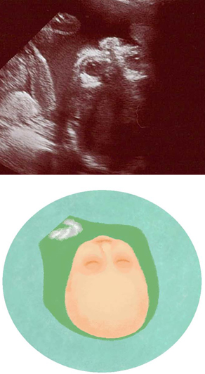 目鼻立ちがはっきりして表情も出てきます。このころ、羊水を飲んで尿として出しています。同時に肺呼吸の準備も進んでいます。