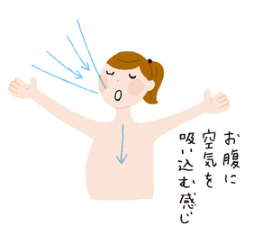 胸式呼吸はゆっくり口から吐き、ゆっくり鼻から吸って、肺に空気をためこみます。息を吸うと肩が上がって、胸の上部がふくらみます。おなかの大きい妊婦さんにとって、無理のない呼吸法です。ただし、力を込めて息を吸うと、かえって緊張状態が高まるので注意しましょう。