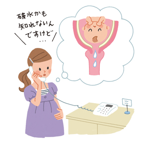 破水は赤ちゃんを包んでいる膜が破れて羊水が外に流れ出すこと。陣痛が始まる前に破水することもあります。破れた場所によって量が異なり、少量の場合は、尿モレとの判別が難しいものです。破水の特徴としては、持続的に繰り返し出る、生臭いにおいがするなどですが、判断がつかないときは、感染の心配があるので入浴は避け、清潔なナプキンをあてて、連絡をしてからすぐに産院へ行きましょう。