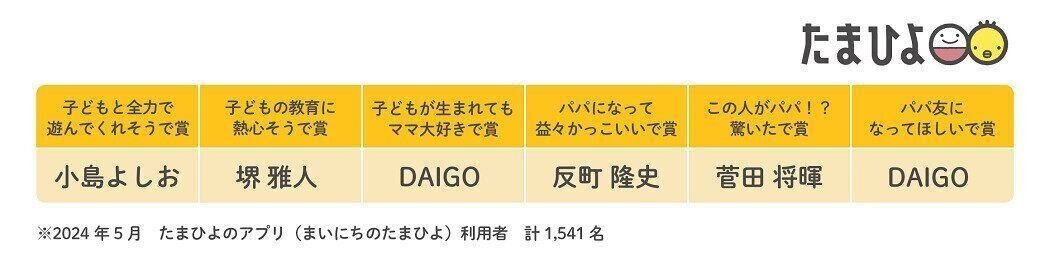 今年は、俳優・タレントのDAIGOさんが、〈芸能人・著名人部門〉1位に輝きました。妻と2人のお子様との時間を大切にされていることや、ユーモアを持って楽しんで育児に取り組まれている姿が子育て世代の支持を集めました。2位には、夫婦でのテレビCMやドラマ共演で話題を集めた反町隆史さんが初ランクイン。また、「子どもと全力で遊んでくれそうで賞」に小島よしおさん、「子どもの教育に熱心そうで賞」に堺雅人さんがランクインするなど、6つの賞もあわせて発表します。