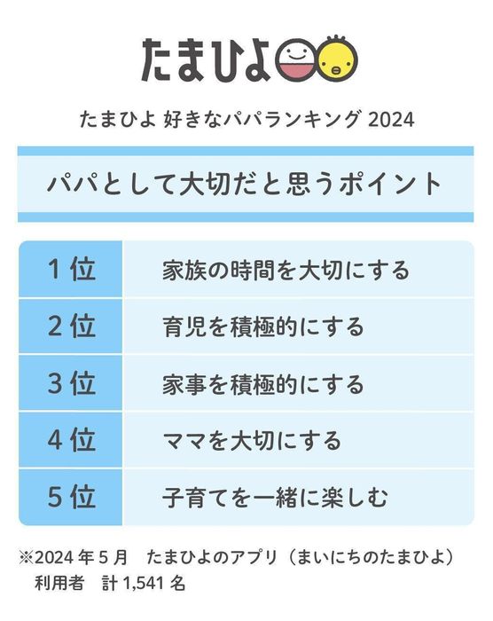 株式会社ベネッセコーポレーション(本社:岡山県岡山市、代表取締役社長:小林 仁、以下:ベネッセ)の妊娠・出産・育児事業を展開する「たまひよ」は、6月16日の父の日にちなみ、たまひよのアプリ「まいにちのたまひよ」利用者の男女1,541人を対象にパパに関する調査実施し、「たまひよ 好きなパパランキング2024」を発表します。