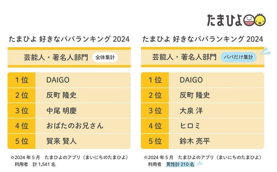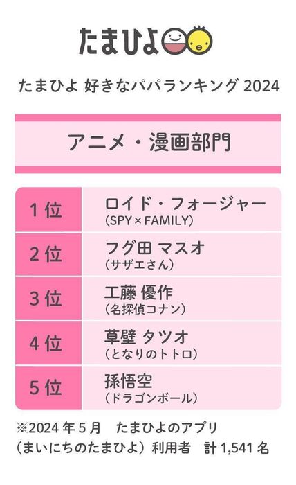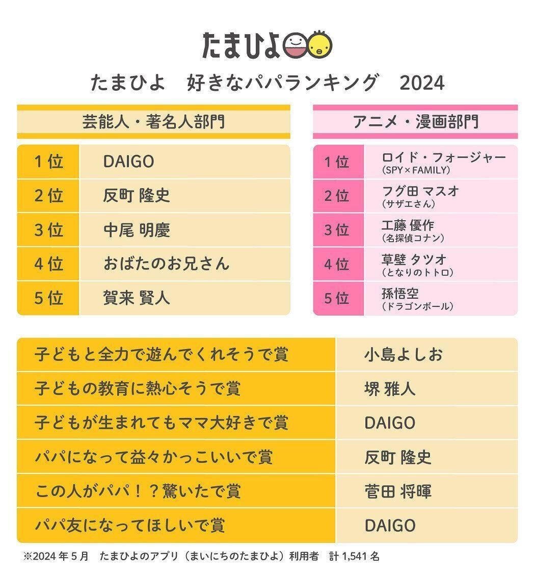 2024年6月16日は父の日 「たまひよ 好きなパパランキング2024」発表! 子育て世代の好きなパパ 〈芸能人・著名人部門〉1位DAIGOさん。反町隆史さんが2位に初ランクイン 〈アニメ・漫画部門〉1位SPY×FAMILY ロイド・フォージャーさん