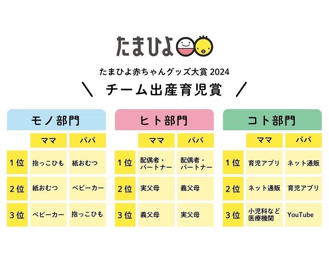~ママ・パパ2000人が選ぶ「第15回たまひよ赤ちゃんグッズ大賞2024」発表~ 「チーム出産育児賞」モノ部門 ママ1位は3年連続「抱っこひも」、パパ1位「紙おむつ」 パパはお出かけグッズ上昇傾向3位に「抱っこひも」が初ランクイン