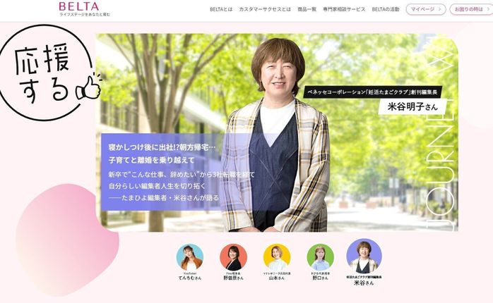 美容健康食品・化粧品のブランド(株)ベルタが運営するWEBメディア「応援する」は、不安、挫折、逆境…様々な環境の変化の中で前を向き進もうとしている女性たちのストーリーをお届けするWEBメディア。こちらに、たまひよ統括編集長米谷明子がインタビューを受け、記事が掲載されています。自身の子育てや仕事との両立、「子育てをみんなで」というたまひよのチーム育児のメッセージについてお話ししています。