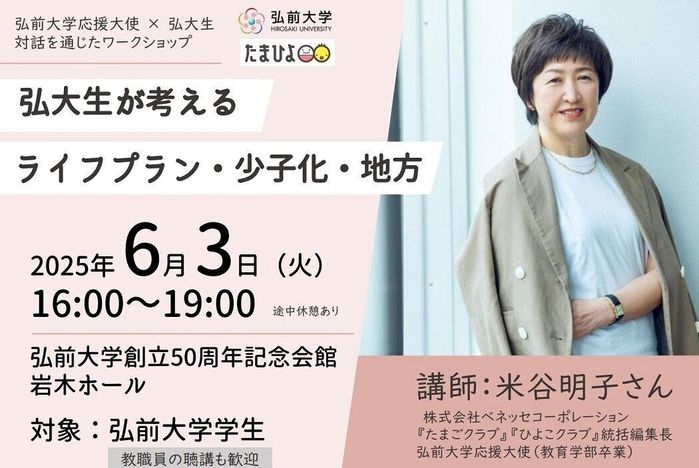 2025年6月3日(火)、弘前大学(青森県弘前市・福田眞作学長)校愛会主催によるイベントで、たまひよ統括編集長の米谷明子が講師として参加し、「ライフプラン・少子化・地方」をテーマにした講演とワークショップを実施しました。第2部の大学生とともに「地方と少子化の課題」について活発な議論が交わされた様子は、ぜひ下記のサイトをご覧ください。