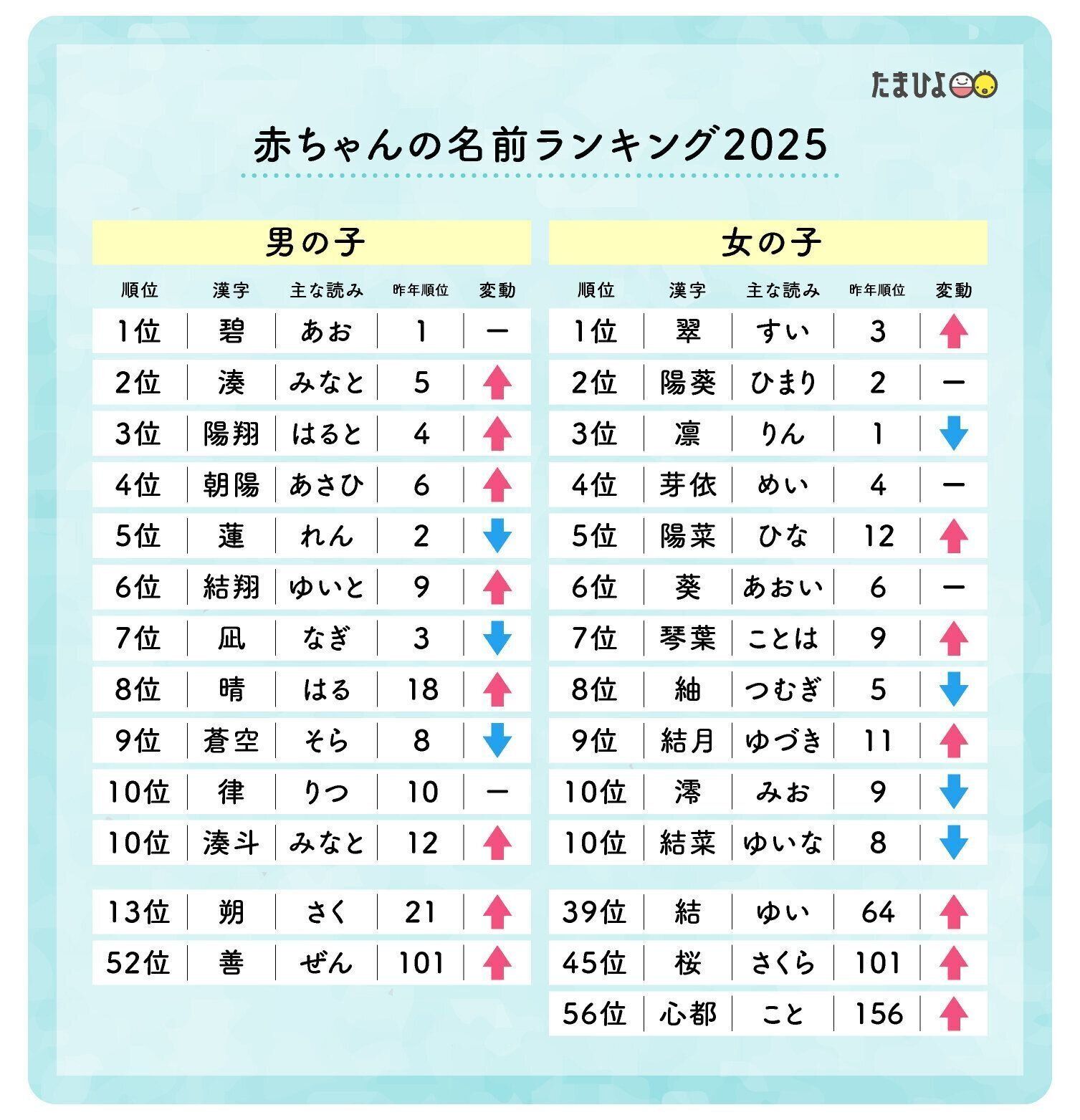 2025年(1~9月)に生まれた赤ちゃんの名前は、男の子は「碧」(主な読み「あお」)が、昨年1位に続き2年連続で1位になりました。女の子は「翠」(主な読み「すい」)が、たまひよ 赤ちゃんの名前ランキング史上初めての1位となりました。また、男の子の名前では昨年100位圏外だった「善(ぜん)」が52位に、「朔(さく)」が13位に、女の子の名前では「結(ゆい)」「桜(さくら)」「心都(こと)」など、日本的な情緒や風物詩を感じさせるようなお名前が上位に並びます。