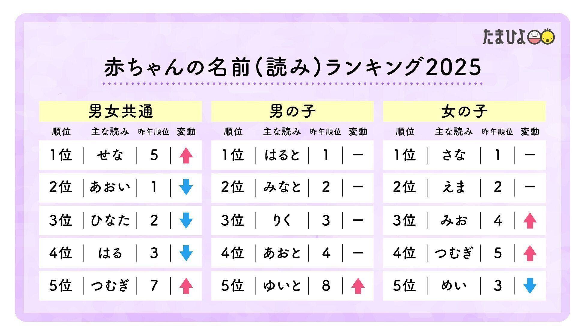 男女共通読みでは「せな」が初の1位。「あおい」「ひなた」は、昨年から引き続き3位内に入っており、男女共に安定した人気を誇っていることがわかります。