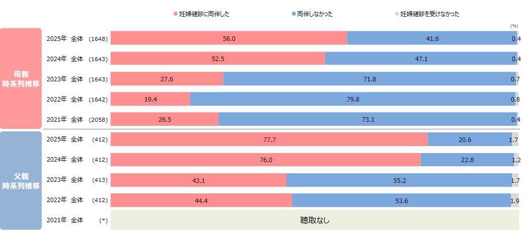 ●妊婦健診への配偶者やパートナーの同伴は、「妊婦健診に同伴した」が母親で約6割と、昨年と比べて増加。
