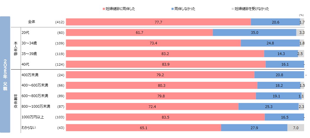 Q.「女性の方にお伺いします。あなたの配偶者・パートナーはあなたの妊婦健診に同伴しましたか?(一度でも)」 「男性の方にお伺いします。あなたの配偶者・パートナーが妊娠中、妊婦健診に同伴したことはありますか?(一度でも)」 ※お子さまが複数人いらっしゃる場合は、一番最近の出産に関してお答えください。