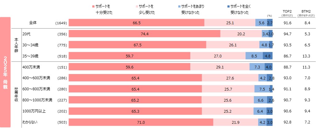 ●妊娠中~産後に、近親者からのサポートを受けた人の割合は約9割で、「サポートを十分受けた」は、昨年から微減。