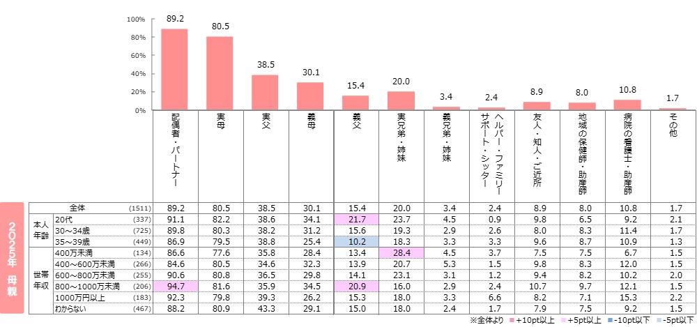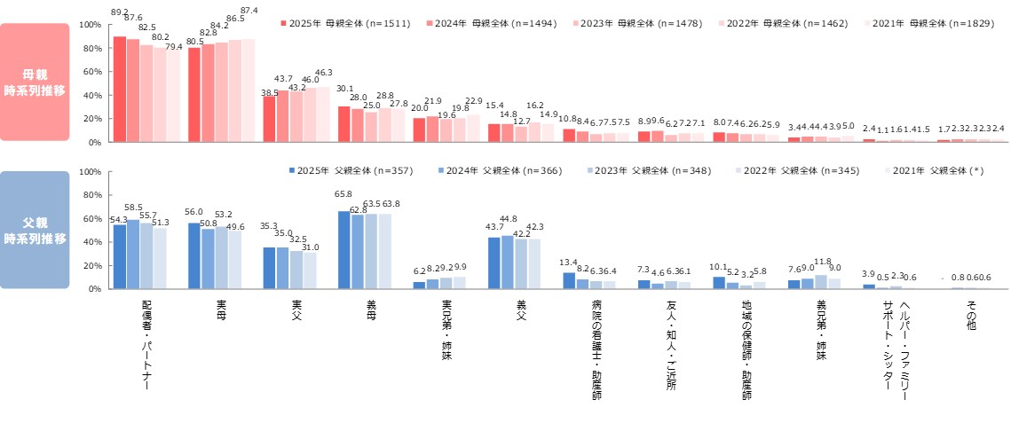 ●母親では、主にサポートをしてくれた人として「配偶者・パートナー」が9割弱で最も高く、次いで「実母」が約8割で上位は昨年と同様の傾向。なお「実母」は減少傾向である一方、「配偶者・パートナー」は増加傾向となっている。