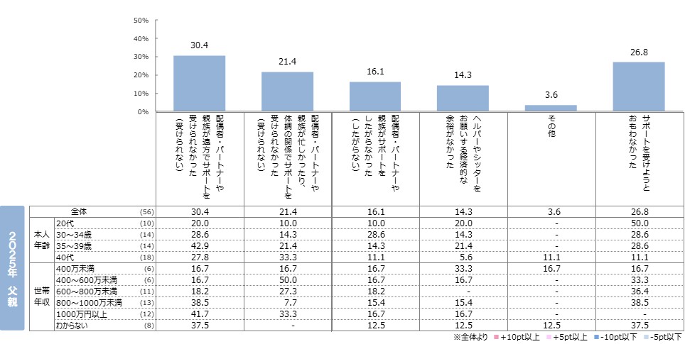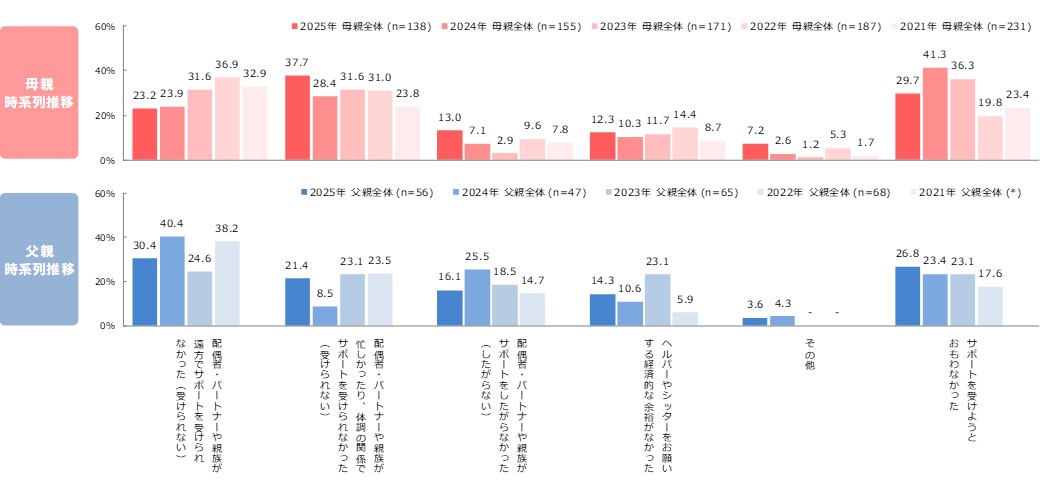●昨年から「サポートを受けようと思わなかった」が母親では減少、父親では微増。