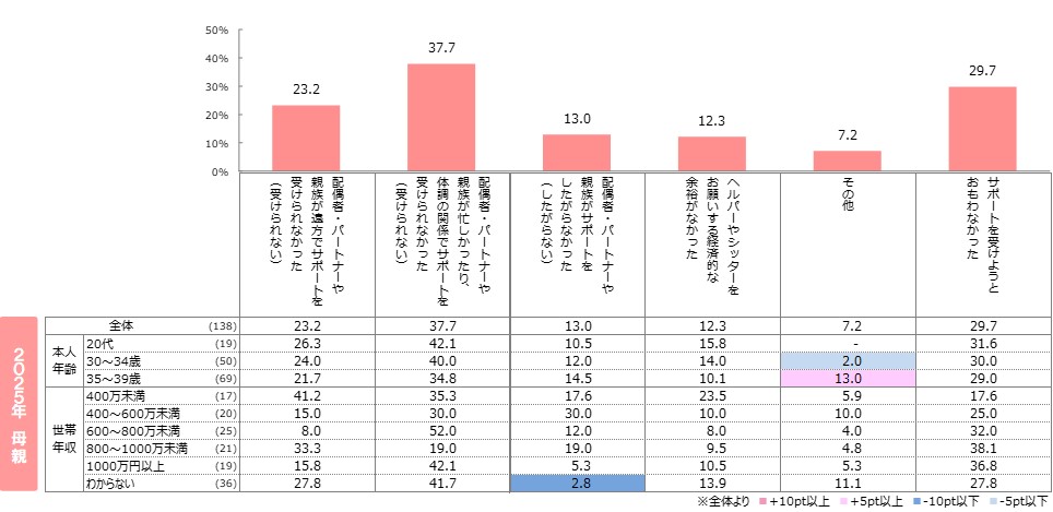 ●近親者からのサポートを受けなかった理由は、母親では「多忙や体調の関係で」が最も高く4割弱で昨年より増加。 「遠方であった為」が続く。
