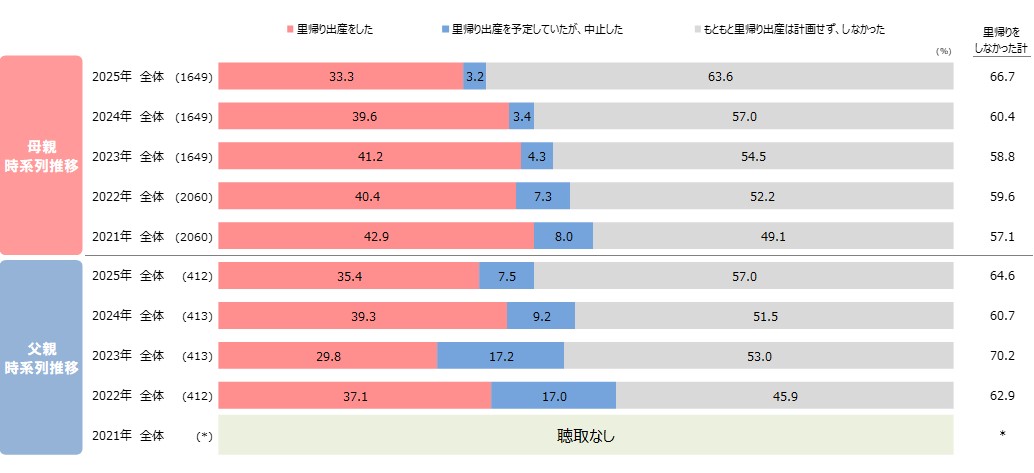 ●また、父母いずれも「もともと里帰り出産は計画せず、しなかった」が増加し、約6割。