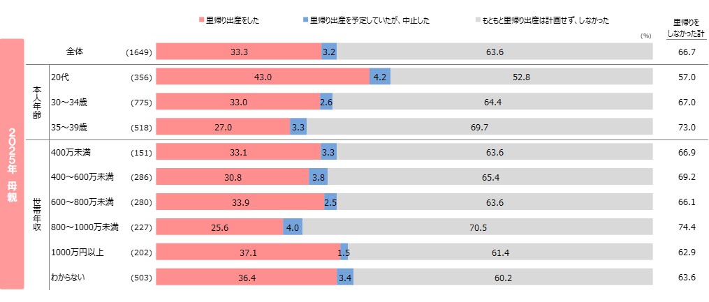 ●本人年齢別で見ると、年齢が低い層ほど里帰り出産した割合が高い。