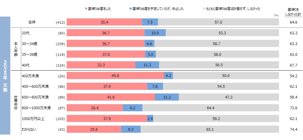 ●里帰り出産をした人は母親・父親ともに3割半程度で、昨年から減少。