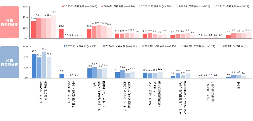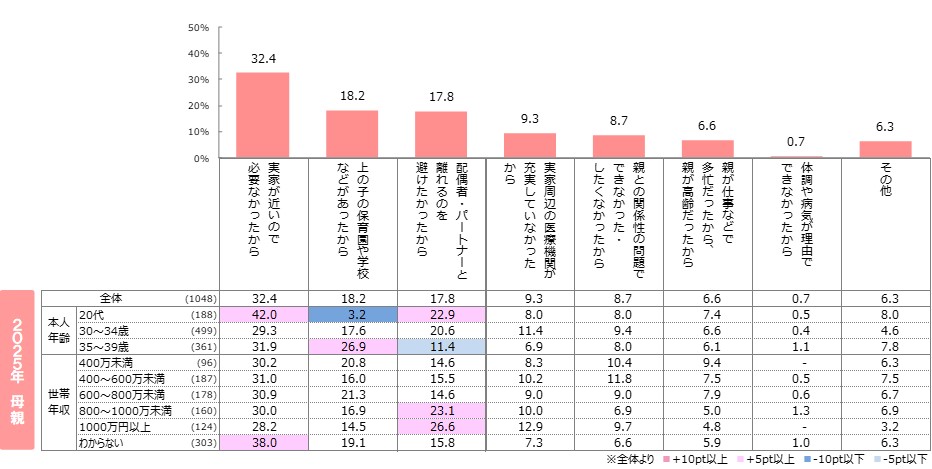 ●母親・父親いずれも「上の子の保育園や学校などがあったから」が昨年と比べて増加し、母親では2番目に高い。