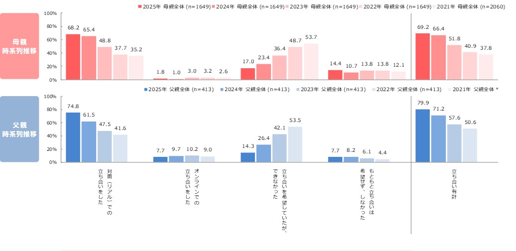 ※2021~2023年の選択肢の「立ち合いを希望していたが、コロナウイルスの影響でできなかった」「コロナウイルス以外の影響でできなかった」は、「立ち合いを希望していたが、できなかった」に合算。選択肢の変更に伴う影響も考慮が必要。