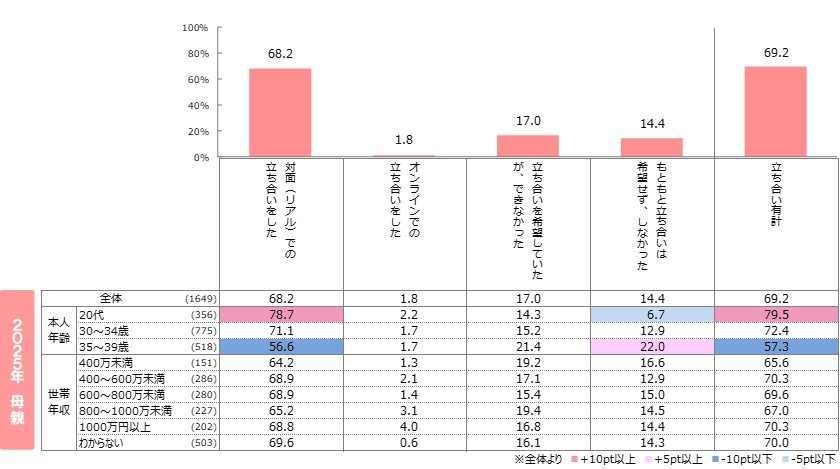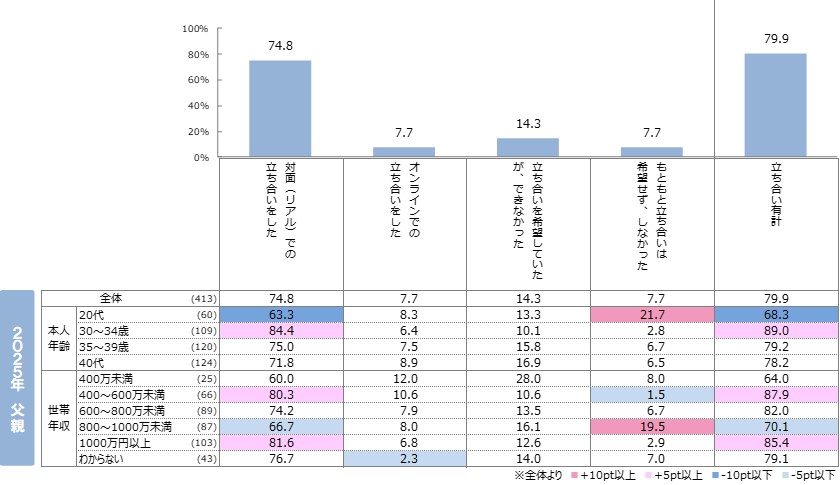 ●父親では、20代で「対面での立ち合いをした」の割合が低く、「もともと立ち合いは希望せず、しなかった」が高い。