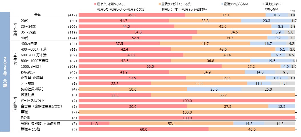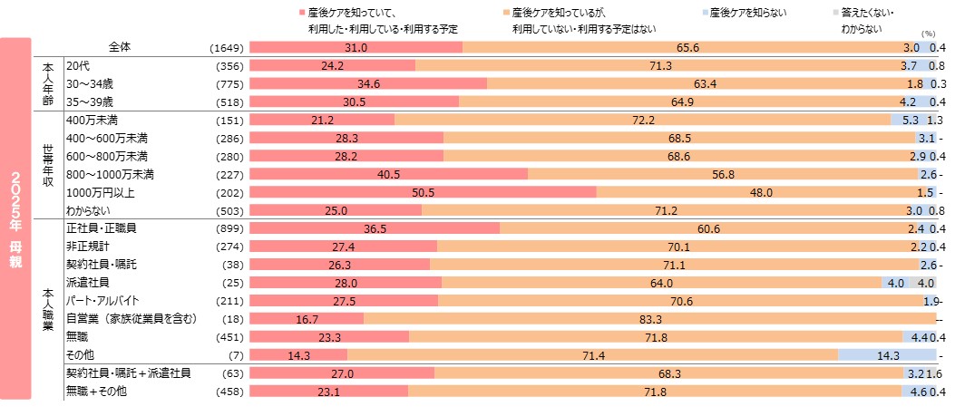 Q.「女性の方にお伺いします。『産後ケア』をご存知ですか?ご存じの方は利用の有無についても教えてください。」 「男性の方にお伺いします。『産後ケア』をご存知ですか?ご存じの方は、あなたの配偶者・パートナーの利用の有無についても教えてください。」