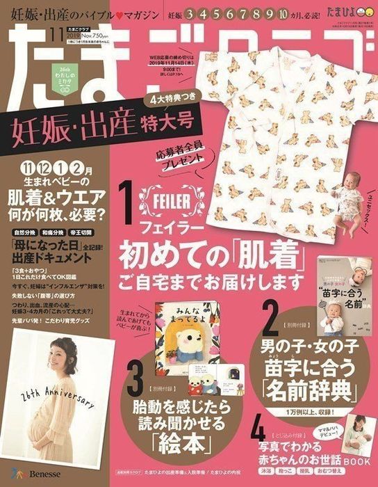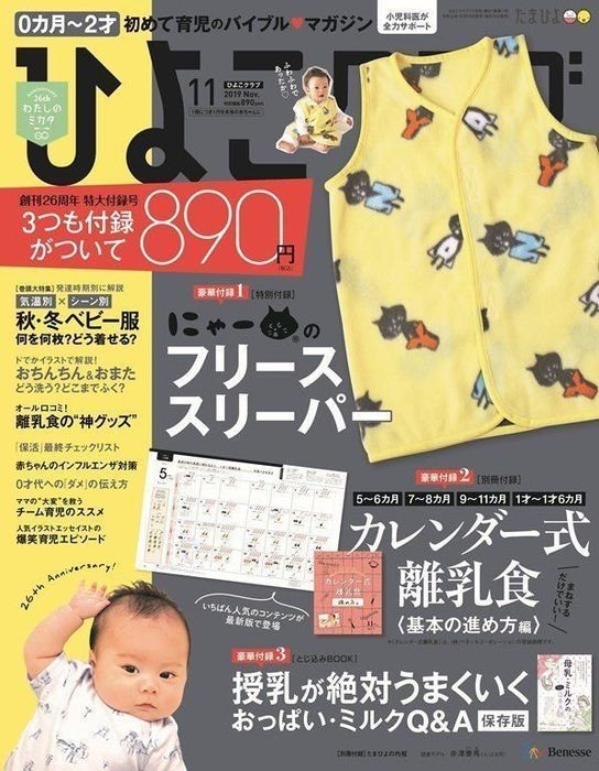 26周年を記念し、『たまごクラブ』では、「FEILERの肌着」を応募者全員プレゼント。名前辞典の別冊付録もついています。『ひよこクラブ』では、「にゃーのフリーススリーパー」が一冊に1個ついているほか、ヒット企画「カレンダー式離乳食」が別冊付録に。大好評発売中です。