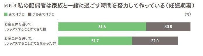 妊娠期に、「配偶者が一緒に過ごす時間を努力して作っている」と感じた妻ほど、出産時にリラックスできたと回答 出典:ベネッセ教育総合研究所「妊娠出産子育て基本調査」