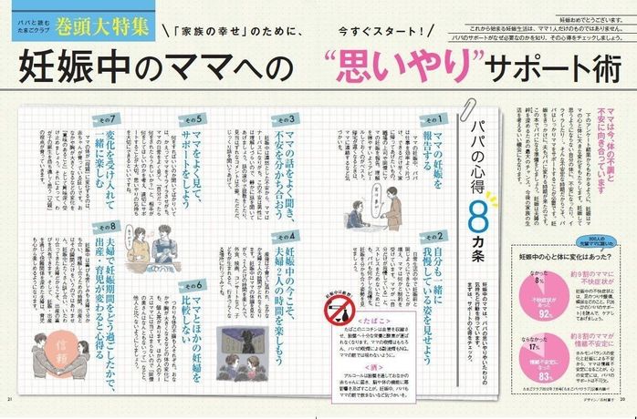こうしたパパ育児を意識した商品をリリースする背景には、妊娠期からの父親の育児への関わりが、その後の夫婦関係に影響するという調査結果(*1)や、すでにイクメンという言葉が定着し、父親自身も育児にもっと関わりたいと考えているにも関わらず、実際は母親に分担が偏るという調査結果(*2)に基づいています。「たまひよ」では、忙しいパパにも手に届きやすいフリーマガジンやアプリという形にすることで、妊娠期からチームで出産・育児を行う大切さを提唱し、ママやパパの不安を解決できるよう応援したいと考えています。