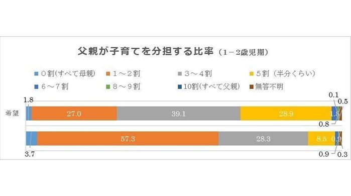 約3割の父親が、母親と育児を半々で分担したいと希望するのに対し、現実に半々であるのは1割未満と母親の分担割合が多くなっている。また、父親の約6割が、19時までに帰宅したいと希望しているのに対し、現実の帰宅時間は7割以上が19時以降と、父親の家庭参加の時間が限られている現状が分かる。