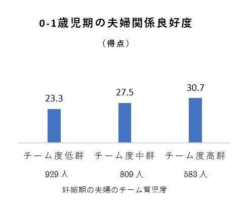 ※妊娠期のチーム育児度は「赤ちゃんをどう育てるか配偶者と話し合った」「出産後の家事・子育ての分担を配偶者と話し合った」「配偶者は妊娠生活を支えてくれた」の3項目の回答の合計得点を基に3群に分別。0-1歳児期の夫婦関係良好度得点は「あなたと配偶者は幸せな結婚生活を送っている」「配偶者といると本当に愛していると実感する」等の9項目の回答の合計得点の平均値。いずれも母親の回答。父親も同様の傾向。*3群間のいずれもP<.0001(分散分析)