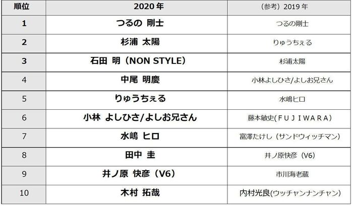 ベスト3のパパたちは、いずれも3人以上お子さんがいて、パパ業に奮闘し妻を大切にする姿を評価されました。1位のつるの剛士さんは、保育士の資格取得を目指されているニュースなどが、3年連続1位の背景にうかがえました。今回初のベスト10入りしたのが、3位のNON STYLEの石田明さん、4位の中尾明慶さん、8位の田中圭さん、10位の木村拓哉さん。石田さんは、双子に次いで第3子が生まれ、SNSでの育児ぶりに称賛が集まりました。中尾さんは、CMでの夫婦共演が高評価だったほか、木村拓哉さんは、モデルデビューした娘たちや自身のSNSで発信される、家族仲の良さが好評で「チチタク」として新しいイメージが歓迎されました。昨年に比較して、メディアなどでパパ色をはっきり打ち出す人が多くランクインし、役柄などのイメージだけでなくリアルに「育児をする」のを評価する傾向もみられました。