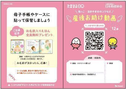 母子手帳に貼れる「産後お助け動画」カードを全国の産院・産婦人科で配布。動画は「抱っこ」「泣きやませ」「病院へ行くべきとき」「災害への備え」の4カテゴリで全12本 。たまひよ公式 YouTubeでも公開。