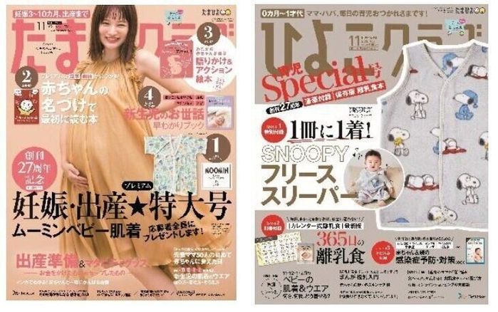 創刊27周年を記念し『たまごクラブ』は、応募者全員プレゼントの「ムーミン ベビー おめかし短肌着」を始め、赤ちゃんの名づけ別冊付録など4大特典つき。『ひよこクラブ』は、「SNOOPYフリーススリーパー」が1冊に1着ついているほか、大人気企画「カレンダー式離乳食」別冊付録など育児Special号となっています。